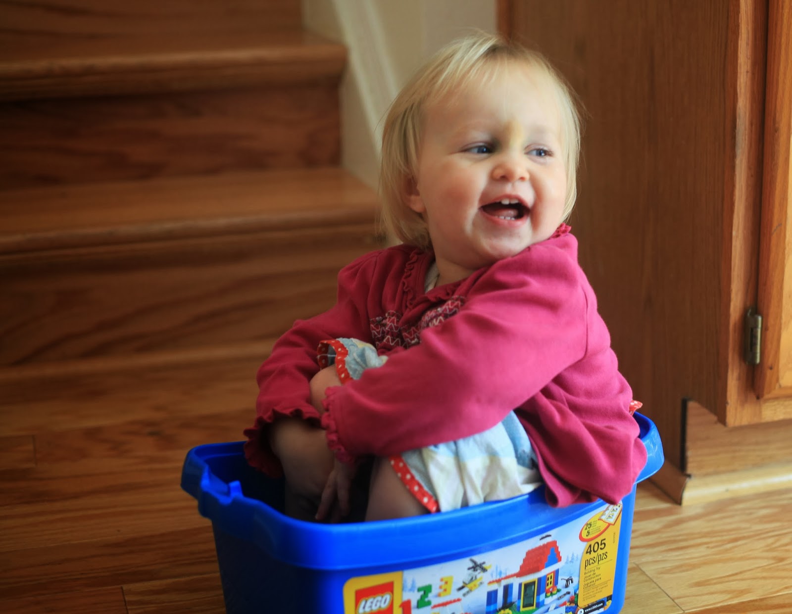 Have I mentioned that I love this age?! (20 months) I think it is so cute. Ruthie just decided that the Lego bucket seemed like a good place to hang out and climbed right in. A great fit.